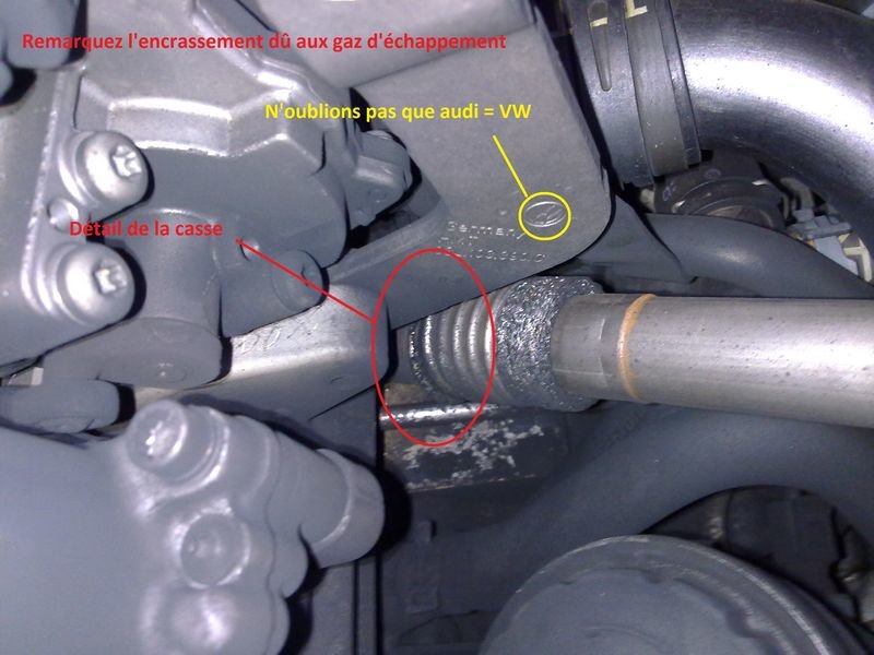 Bonsoir les amis, Je vous fais part ce soir de ma premiere panne avec mon A4 b8 tdi 143cv. Elle totalise aujourd'hui 163 000 kms et la durite en inox qui le relie la sortie turbo l'entrée de la vanne EGR à fissuré ou cassé (j'attend la pièce démonté pour vous en dire plus). J'ai un problème de plus car ma garantie constructeur a expiré il y a 1 mois !!!! quelqu'un aurait un conseil pour faire passer cette casse aux frais d'audi ? car mon garagiste me dis que même si elle était encore sous garantie cette panne ne serait pas pris en charge par la celle-ci. Suis-je le seul a qui s'est arrivé ? J'ai eu le garage au tél ce matin : résultat = 5 jours pour la livraison de la durite sans compter le montage. et pas de voiture de remplacement...... la misère quoi . Ci-joint deux photos :