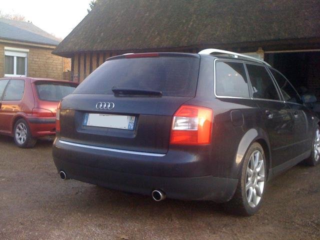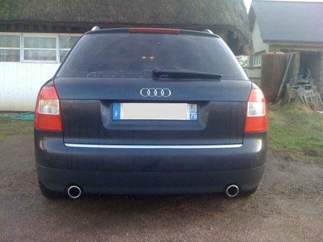 Pas de probleme, je vous fait ca ce soir!! Pour les embou, je les ai pris chez Norauto car aussi surprenant que cela puisse paraitre, ils vendent des sortie de pot tres tres proche de celle d'origine (juste un peut plus grosse, mais ca va beaucoup mieu à l'A4, c'est mon avis) pour 19€ pieces, soit beaucoup moins cher que chez Audi. Rassurez vous, ca fait pas du tout rajouté, ni tuning !! ;-) A 18h ce soir je vous fait ça! -