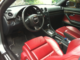Une nouvelle voiture au forum : A4 Cab B7 S-Line 2.0 TFSI Multitronic Couleur Q4/Y7 selon le document officiel (gris quartz ?) / capote noire Intérieur cuir rouge Jante 18" Acheté en Allemagne en mars dernier J'adore.... sauf les inserts en bois que je vais faire passer en carbone quand j'aurai trouvé la bonne formule. Pour les photos, dès que je trouve comment les mettre sur le site, j'en poste quelques une -
