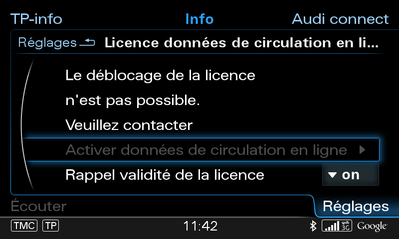 Bonjour Thierry Alors le TP link est relié en wifi à la box donc en WISP... Je viens de refaire des tests et j'ai remis la carte SIM contenant le script que tu m'a fais parvenir... Chose étonnante j'ai vu une image en russe ..... j'ai appuyé sur le joystick et autre image trés rapide et puis miracle !!! j'ai bien accès à google .... je vois bien la carte à l'échelle de 30 mètres (j'ai noté que au dessus de 75mètres il n'y a plus rien il me semble...) Quant je vais cliquer INFO puis AudiConnect j'ai accès à (de mémoire) météo, et autres POI particuliers Par contre il me semble avoir lu qu'il fallait activer une licence ???? Ou se passe cette manip ? -