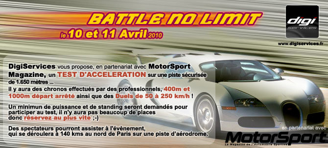 Bonjour à tous. Digiservices, en partenariat avec Motorsport Magazine, organise un grand test d'accélération sur 2 jours, avec du matériel professionnel pour valider les temps sur 400m et 1000m. Dans le même temps, des duels sur des 50-250 km/h auront lieu. Cet évènement se déroulera sur une piste d'aérodrome située à 140 kms de Paris. Les places seront bien sur limitées, nous invitons donc tous ceux qui souhaiteraient y participer à nous envoyer leur candidature sur le mail : [email protected] Petite précision: un minimum de 400cv est demandé, ou un RPP en dessous de 4. Afin de vous offrir un plateau et un spectable des plus impressionant, nous limiterons les candidatures à des véhicules dont les performances/puissances se situent dans la categorie des GT/supercar. Merci de donner votre nom (ou pseudo), votre voiture, modifs et puissance (poids si vous connaissez votre RPP). Nous vous répondrons dès que possible. Pour les voitures selectionnées, un cheque de réservation de 150 euros devra nous etre envoyé, cheque que nous vous redonnerons le jour de votre venue, ou que nous encaisserons si désistement. Pour les non sélectionnés, vous pourrez venir assister à tous ces tests en échange de 8 euros. Nous sommes désolés de ne pouvoir satisfaire tout le monde... N'hésitez pas à faire circuler, afin d'avoir le plus beau panel de supercars possible Je vous tiendrais informé de la liste au fur et à mesure ! Posez également vos questions, j'ai peut etre oublié quelque chose ! MERCI A TOUS -