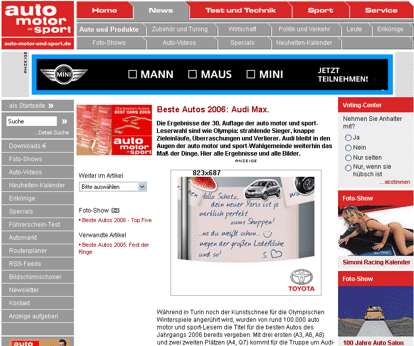 Bonjour, >>>100.000 lecteurs d'auto motor und sport<<< ont voté pour les meilleures voitures 2006. [attachmentid=16202][attachmentid=16203] C'est pas mal. Bonne route!