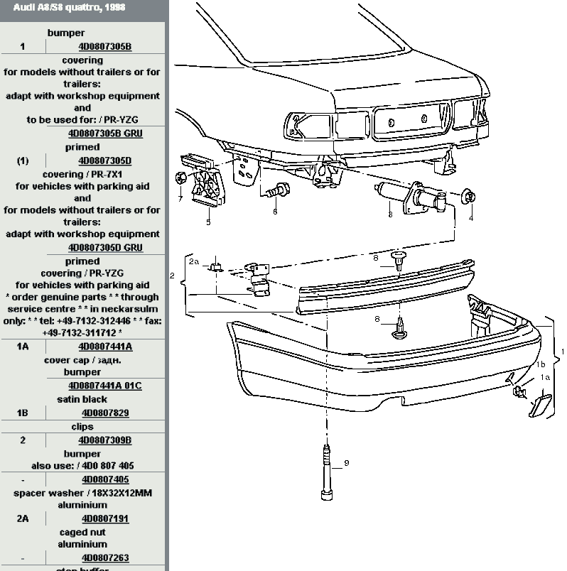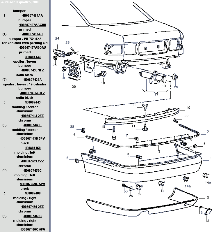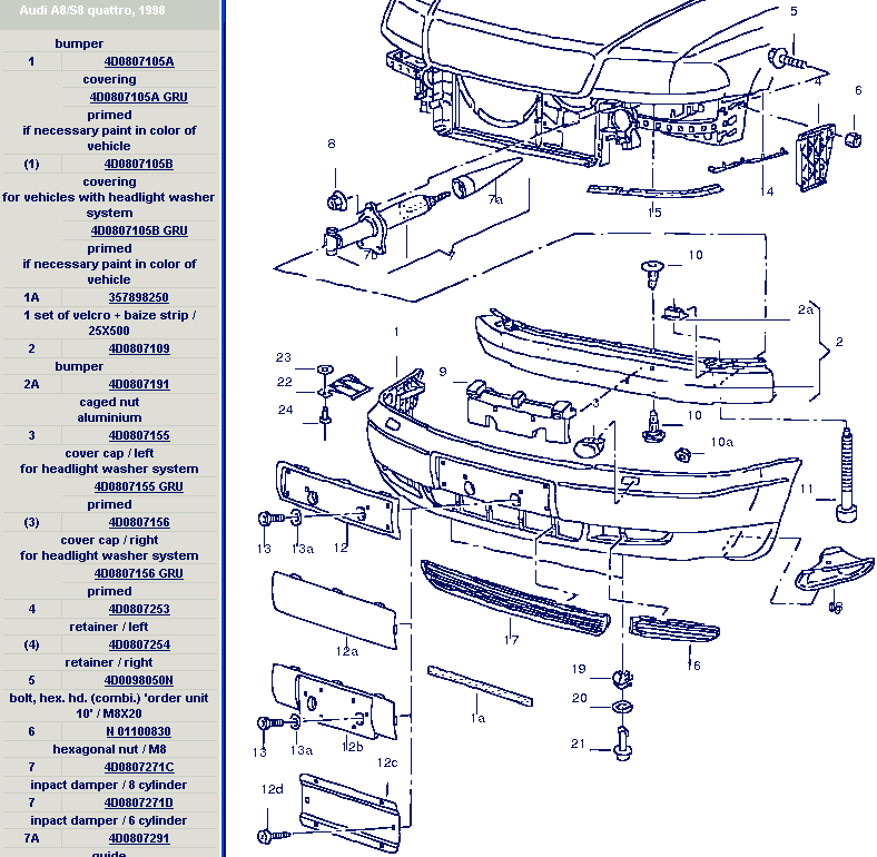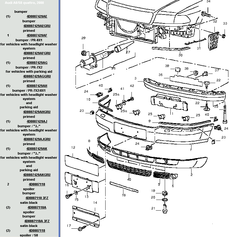 Bonjour, l'A8 1998 est équipée du pare-chocs avant 4D0807105 et du pare-chocs arrière 4D0807305, tandis que l'A8 2000 est équipée du pare-chocs avant 4D0807429 et du pare-chocs arrière 4D0807497. [attachmentid=15615][attachmentid=15614][attachmentid=15613][attachmentid=15616] Bonne route!