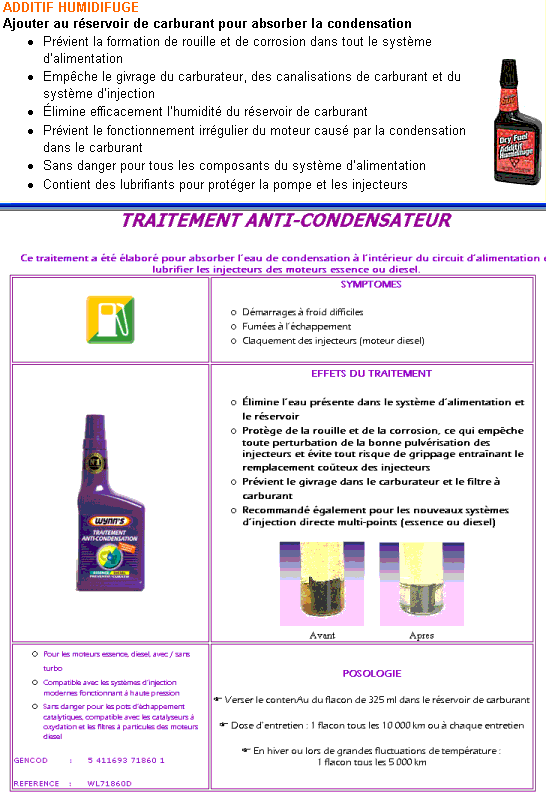 Bonjour, pour enlever l'eau de condensation qui se trouve dans le réservoir à essence, mais aussi à différents endroits du circuit d'alimentation, il y a les additifs humifuges et les traitements anti-condensateurs. >>>absorbtion d'eau dans l'essence<<< [attachmentid=15640] Bonne route!