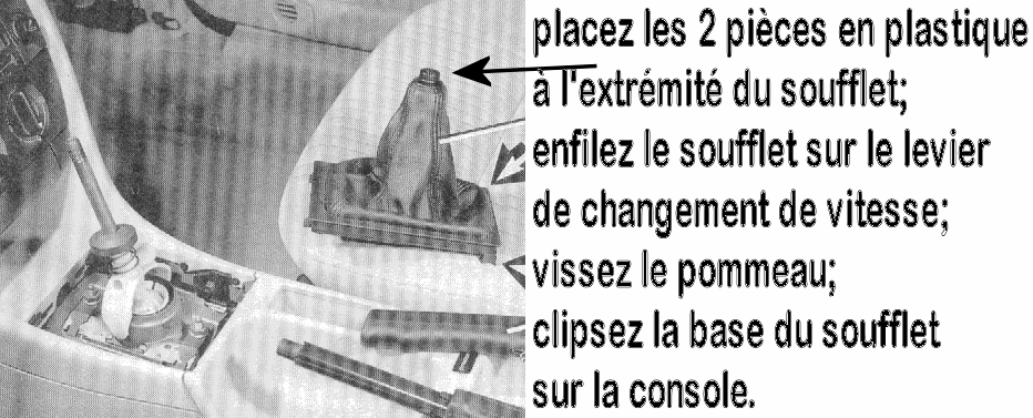 Bonjour, il me semble que dans le post précédent, tout est >>>là<<< On voit quand même bien sur la photo comment le plastique est monté sur le cuir (flèche noire) le petit plastique sur l'extérieur et le grand à l'intérieur du cuir . Puis comme indiqué on enfile le soufflet (muni de ces 2 platiques) sur le levier de commande de changement de vitesse, puis on visse le pommeau sur le levier de changement de vitesse. Si j'étais la RTA, je dirais: "vous faites dans l'ordre inverse de ce que vous avez fait pour démonter". Bonne route! -