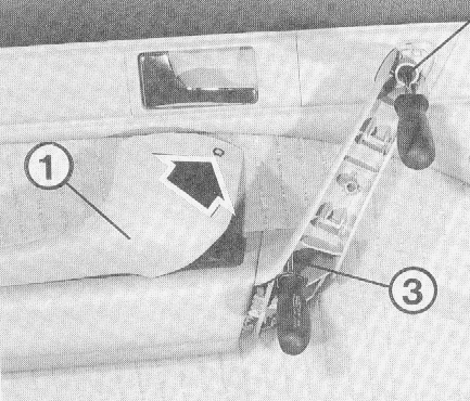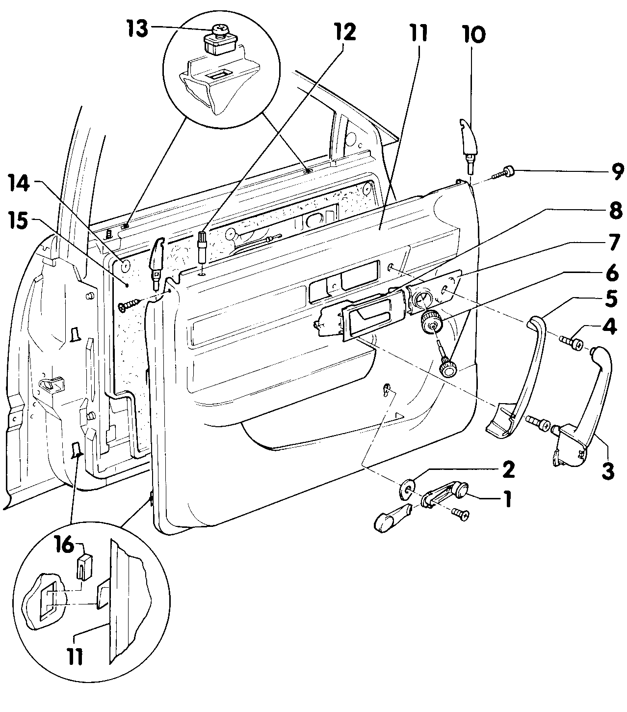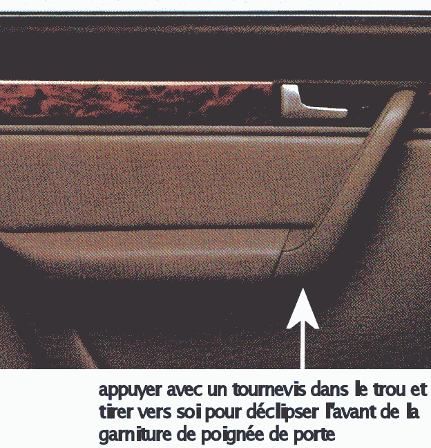 Pour enlever la garniture de porte arrière (comme pour une porte avant), à chaque extrémité supérieure de la garniture dévisser la vis (9). Soulever la garniture (en lui donnant quelques tapes vers le haut) afin qu'elle se déboîte de ses fixations (16+11). Attention de ne pas perdre de petits caoutchoucs (16) anti-bruit. [attachmentid=2323] Bonne route! -