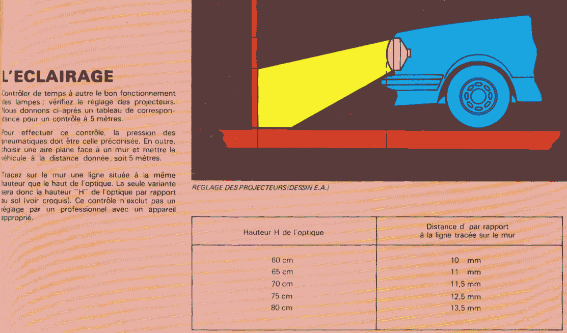 Bonjour Pyax, Excusez-moi si mon message vous a agressé, ce n'était pas le but, c'était une réflection simplement purement mathématique sur la méthode, cela n'avait rien de personnel. Je pense que le réglage que vous avez proposé n'est pas une méthode générale de réglage, mais celle spécifique à un type de véhicule (R5 par exemple). Il ne faut pas oublier qu'un phare peut comporter plusieurs optiques et qu'une optique peut parfois servir à un ou plusieurs feux (exemple: un phare composé de 2 optiques, une (H4) servant pour feu de route et code (ou suivant les pays: croisement ou ville) et l'autre pour anti brouillard (H7 ou H1) plus la fonction feu de position ou de gabari. Bien que se trouvant incorporées dans un unique phare, ces optiques peuvent avoir un haut se trouvant à des niveaux différents. Vous avez en France de d'excellentes publications techniques automobiles dont entre autres "L'EXPERT AUTOMOBILE" (19, rue des Filles du Calvaire à 75140 PARIS CEDEX 03). Celle-ci publie une série d'ouvrages d'études des différentes voitures vendues sur le marché français sous le titre la "REVUE PRATIQUE DE TECHNIQUE AUTOMOBILE". Au début de chaque étude, on retrouve une vingtaine de pages de généralités dont j'ai extrait ceci: [attachmentid=2436] Bonne route!