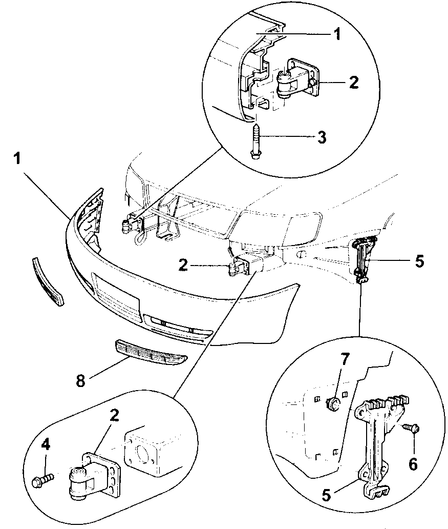 Bonjour, les indications données précédemment concernaient l'Audi 100/A6 type C4 (jusqu'en 1994), Audi a équipé les A6 suivantes d'un pare choc simplifié (constitué de moins de pièces) dont voici la vue éclatée. [attachmentid=2477] Bonne route!