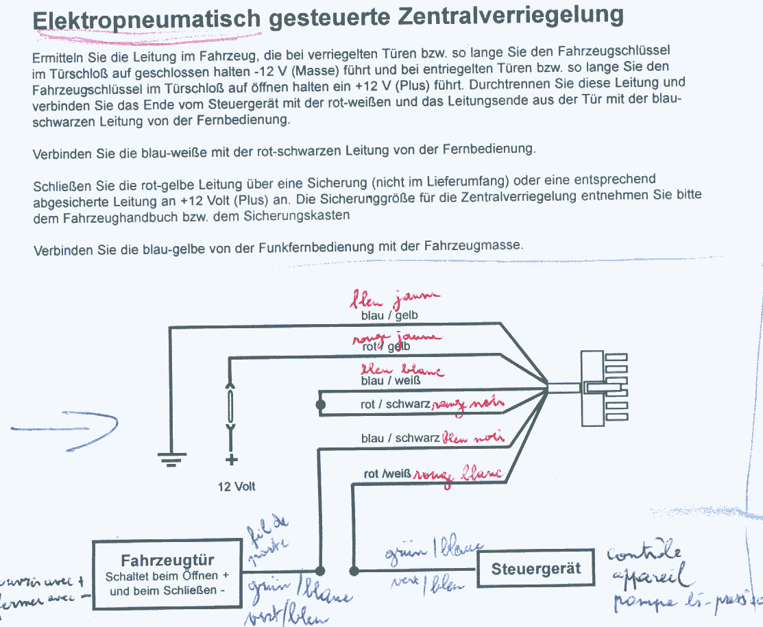 Pour raccorder la télécommande sur un verrrouillage pneumatique, dans le montant avant droit (près de la poignée d'ouverture de capot moteur) couper le fil venant de la serrure de porte conducteur (en général un vert/bleu) et intercaler votre système de télécommande radio (voi exemple ci-dessous). La télécommande radio fournira une impulsion positive pour provoquer l'ouverture des portes via le verrouillage central et fournira une impulsion négative pour la fermeture. [attachmentid=2482] Bonne route! -