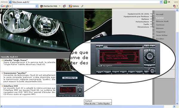 12. Salut! Je me rappelle qu'allroadusa a envoyé il y a peu de temps la photo d'un RNS-E avec ecran monochrome non pivotable... c'était je crois pour une A4 sur les marchés du moyen orient sur le site audi.fr en ce moment, cette meme image illustre le RNS-E de la berline A3 faceliftée (voir image) [attachmentid=7220] quelqu'un sait il si audi a décidé de mettre cette option sur l'A3? et si oui remplace t elle le RNS-E "classique" ou plutot le GPS ODB/CDROM de base? dernière option : le webmaster est ptet' à cours d'illustrations et a mis celle là "par hasard".