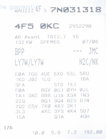 Bonjour à tous, toujours en quête de ma future A6, j'ai trouvé une occasion que je devrais aller essayer samedi si tout va bien. Cependant, je me pose des questions sur la finition et les équipements, car elle est vendue en tant que 2.7 TDI DPF 180 ATTRACTION, mais avec pas mal d'équipements en plus par rapport à la finition Attraction dont GPS couleur, radar de recul, clim digitale. J'ai eu le numéro de châssis : wauzzz4p57n031318 J'ai aussi la liste des codes Audi (voir pièce jointe). Est-ce que qqn aurait la possibilité de me dire si c'est effectivement une finition Attraction ? Dans le même temps, comment déterminer la version du MMI ? Et pour l'historique de son entretien, je peux appeler n'importe quelle concession Audi ? Merci d'avance Seb -