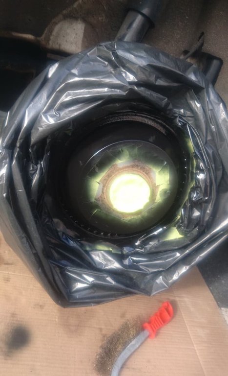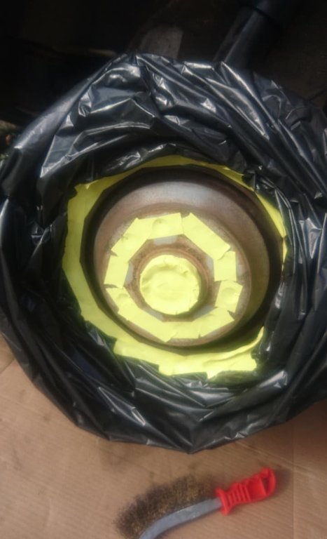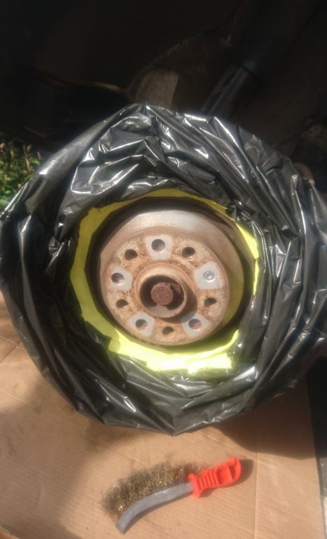 Mince ! Enfin un jour il faudra qu'on fasse ça ! Aujourd'hui j'ai eu le temps de faire mes bols de disque, très content du résultat. Procédure simple -Démontage des roues - Ponçage de la zone rouillée (brossé métallique + papier à poncer) - nettoyant frein partout - Masquage (Scotch + sac poubelle) - Une couche d'antirouille en bombe - 2 couche de peinture noir mat haute température -