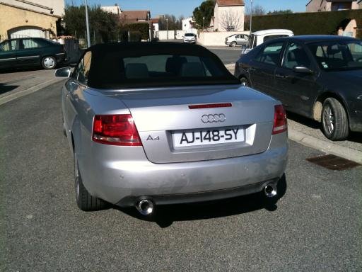 Bonjour a tous , voila romuald 22 ans je possede depuis peu une audi a4 cabriolet de 2007 dont je suis follement amoureux lol j'habite dans la drome prés de montélimar !! mon petit parcours auto : ax gti, polo 1.4 8s, polo gti, mégane coupé, 206 s16, 307 xsi, corsa opc, bmw 118d, et finalement a4 cab :D la voiture n'a pour l'instant rien de plus que l'origine (clim, jantes 17", gps, siege chauffant, régulateur...) quelques photos : ce que j'aimerais effectuer dessus : - jantes rs4 18 ou 19" - feux a led avant - reprog a 170/180 cv donner votre avis pour les jantes en quelle taille et pneus ainsi que si vous connaissez pour la reprog en rhones alpes ou paca ou languedoc roussilon dite moi merci par avance