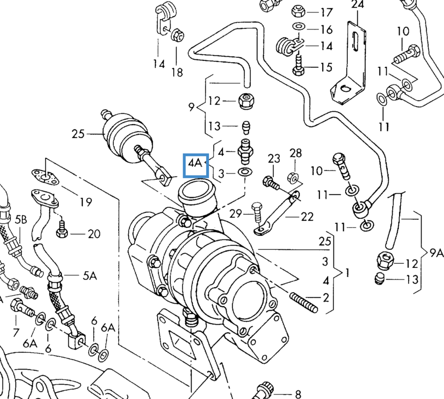 Salut, https://audi.7zap.com/fr/rdw/audi+a4+avant/a4/2009-636/1/145-145065/ L'autre extrémité ne se situe t-elle pas sur le support de filtre à huile au niveau du manchon rep 6A de l'éclaté suivant ? https://audi.7zap.com/fr/rdw/audi+a4+avant/a4/2009-636/1/115-115055/ Avant de remplacer la tuyauterie : Est-ce qu'il y a un mamelon de vissage sur le turbo ? Est-ce que ce ne serait pas lui qui serait desserré (voir localisation sur le PDF que je te joins).... ça m'est déjà arrivé. Sur l'éclaté concernant mon A4 de 96, on voit bien ce mamelon rep 4 avec son joint rep 3 @+ Doc1.pdf