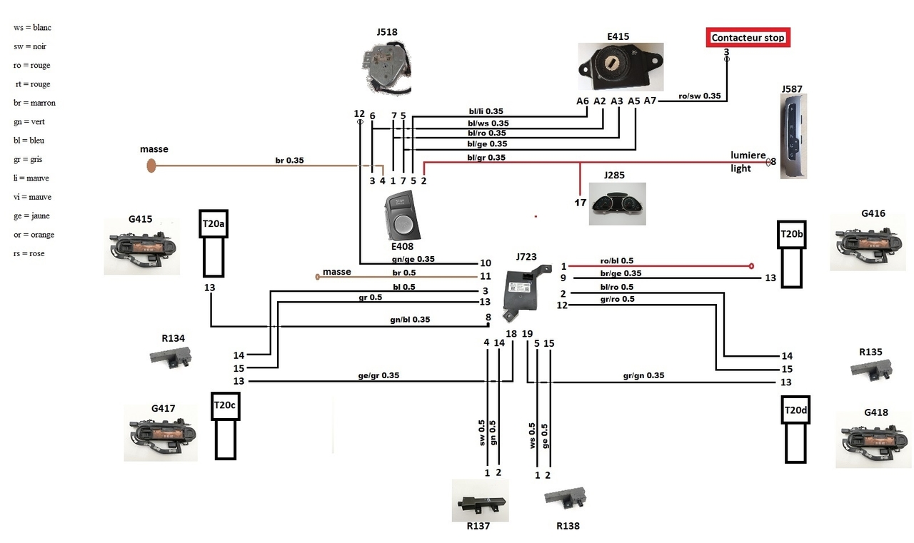 Salut a tous Je reviens donc avec les infos du volant deja, car il y a eu du retard avec les infos. Voici donc la photo avec les dimensions prises cette apres midi. Comme precisé avant, ce volant ne pas assez confortable que celui que j'avais avant, celui de la RS6 C6. Concernant les dernieres modifications en cours ça a avancé pas mal. -soft close - OK depuis longtemps -colonne de direction a reglage electrique - OK -keyless - en cours - manque la clef keyless, a acheter et appairer en concession -TPMS - en cours - manque le raccord des 4 fils a la pompe ABS -home link - en cours - manque le branchement devant -ACC - en cours- manque le radar et le compteur ACC, mais celui-ci je compte l'achete plus tard. Le travail sur le TPMS et le home link sera fini au moment de l'installation du radar ACC, car je ne compte faire tomber le parechoc qu'une seule fois. Ayant cette semaine un peu de temps libre, j'ai reussi a finir d'installer tous les cablages, voici des photos: -calculateur de keyless, les deux cablages keyless, l'antenne pour le coffre, le nouveau contact et le bouton start & stop Dans ces photos avec la voiture demontée on ne voit que la moitie du bordel... car pour passer le cablage keyless j'ai ete obligé de demonter le coté passager aussi et soulever la moquette pour passer le fils. Une photos d'avant Et des photos d'apres Ca fait plaisir de voir le volant monter et descendre pour agrandir le passage au cockpit. Le commodo de regulateur ACC a ete installé au meme temps que la colonne electrique... Pour le moment je peux juste couper le contacte et arreter le moteur avec le bouton STOP, le START ne fonctionnera qu'apres l'appairage de la clef keyless. Et j'ajoute aussi la schema simplifiée que je me suis fait pour faciliter la creation des cablages. Comme moi j'avais deja installé les cablages des portes, cette schema ne ne va que jusqu'aux portes. -