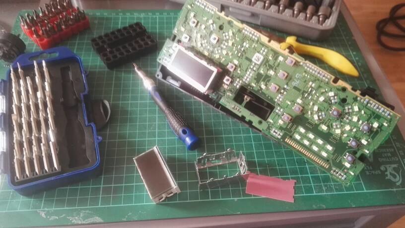 Salut Je reviens avec une petite présentation, du travail effectué pour changer la couleur du rouge au blanc. Mais ça ne peut pas se faire sans changer les écrans d'origie avec ceux ci: https://www.aliexpress.com/item/32934411766.html?spm=a2g0s.9042311.0.0.60274c4dfW8zFf On ne peut meme pas appeler ca un tutoriel, il n'y a pas assez d'explications, mais ça peut bien aider pour montrer le boulot qui sera a faire. Je précise que sans les écrans achetés sur aliexpress le rendu ne sera pas pareil, les écrans seront bleu foncés et le redu tres moche. D'abord il faut démonter le panneau de clim et le poser sur la table, on ne peut pas travailler sur la voiture. Voici la video pour voir comment faire. Une fois sur la table il faut deviser les 6 vis qui tiennent la façade, et ensuite séparer la plaque eélectronique de la façade, pas des visses pour ça. Mais il fait faire attention quand on déclipse les cables, soyez prudents avec le tournevis... Il faut ensuite démonter les écrans, car ils sont fixés par derrière, avec ces 6 fixations. Voila a quoi ça ressemble quand l'ecran est demonté. Apres il faut désouder les leds rouges d'origine, et les remplacer par des leds blanches. Une fois les 2x8 leds remplacé, vous pouvez remplacer les anciens ecrans avec les nouveaux ecrans, ceux qui sont dans le lien plus haut. Pour cette opération j'ai pas pris des photos, mais c'est un jeux d'enfant pour les enlever et le remplacer. Une fois les leds blanches soudées on remonte tout dans le sens inverse. Et on teste... Si tout est bon... il y a plus que profiter du nouvel affichage. Mais je me suis rendu compte le lendemain que ca eclairer trop fort, regarder cette photo comme a droite ca ecclaire fort par rapport aux leds rouges qui sont a gauche. Alors j'ai tout démonté, et j'ai collé sur les films roses qui sont a l'arriere des écrans 3 couches de scotch blanc-transparent. Ca s'appele Scotch magic. Rassurez vous, quand vous allez démonter l'ensemble vous allez comprendre toute de suite de quoi je parle. Donc 3 films de scotch par dessus du film rose qui est derrière chaque ecran. J'ai prix la photo de yoyovento pour vous montrer le film rose. Et voila le rendu final. Pas de tout gênant, on les observe plus... comme des l'origine sur les autres Audi. -