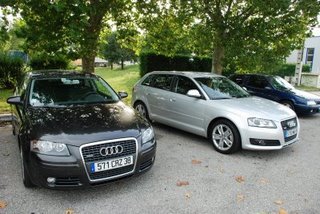 J'avais déjà posté 2 petites photos et quelques remarques dans un autre sujet... mais voilà enfin une présentation en règle de ma voiture! Il s'agit donc d'une A3 Sportback TDI 170 Quattro facelift, qui vient remplacer ma TDI 140 Quattro de 2005. D'ailleurs les voilà toutes les deux, l'ancienne et la nouvelle! Au niveau des équipements, j'ai choisi une finition Ambition avec en option: - le pack Xénon - l'adaptateur Ipod - le contrôle de pression des pneus - les rails de toit Je l'ai reçue début septembre, mais seulement 3500 kms au compteur pour l'instant, vu qu'elle a été pas mal immobilisée suite au souci mécanique décrit dans un autre post. Ce que j'aime: Malgré ce soucis mécanique qui me gâche la vie, cette voiture est vraiment géniale. La direction est super douce, le moteur beaucoup beaucoup plus silencieux que mon ancien TDI 140... et très souple. Plus question de se passer des xénons une fois qu'on y a gouté, il n'y a vraiment pas photo! Et pour le reste, les finitions sont toujours aussi soignées et la qualité est au rendez vous. L'affichage de l'ODB est amélioré, maintenant on a un capteur de température d'huile consultable par le menu Info Ce que j'aime moins: - le bruit de roulement me parait plus important qu'avant, peut être du aux pneus Dunlop - le nom des listes de lecture de l'Ipod ne sont pas affichées sur l'écran de l'autoradio, on a juste CD1, ... CD6... peut mieux faire! - le plastique des portières me semble plus "cheap" que sur la version précédente - la position du levier de régulateur de vitesse n'est pas très ergonomique - l'info de vitesse idéale devant être enclenchée me fait un peu sourire... Voilà donc au niveau des premières impressions. J'espère que mon problème méca va être résolu très vite pour pouvoir enfin en profiter pleinement, surtout maintenant que la saison de ski va commencer! Le Quattro couplé aux Trak, un vrai chasse neige :bigsmile: :coucou: -