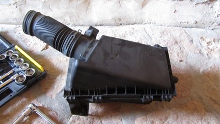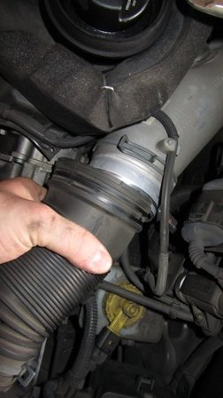 Phase 1 : démontage de du filtre à air Laisser le collier sur le conduit en alu ça evitera de désserer le collier complètement. désserer les 2 fis du filtre à air et débrancher la durit de prise d'air et la connectique du débimètre d'air. sortez le en tirant sur la gauche pour démancher le téton de centrage. poser le filtre dans un endroit sans poussière si possible. ps : l'emplacement de la sonde ce situe sur la pipe à eau entre le filtra à air et la pompe Tandem. -