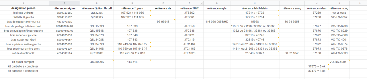 salut la team j'étaye le post j'ai fait des classeur avec les références du train avant et les détails et équivalences , j'ai mis plusieurs format si vous voulez ajouter des références ou participer corriger erreurs ou autre train avant complet RS6 références.ods train avant complet RS6 références.xlsx train avant complet RS6 références - Feuille 1.csv -