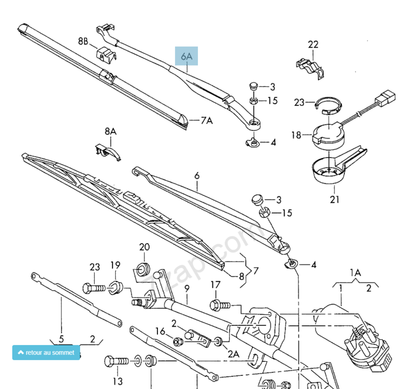 salut a tous je reviens sur mon tuto j'ai du remplacer le mécanisme complet par un origine trouver sur le net , j'y suis revenu parce qu'il était impossible d'ajuster les bras un coup il tapait en bas sur les guide d'eau un coup sur les baguette latérale de par-brise , en comparant les 2 on comprends la subtilité il un angle légé de quelques degrés vers le haut en rouge le notre en jaune le standard sur A6 autre point important ce capuchon d'axe malheursement il m'en manque 1 en rouge en jaune on voit qu'il est manquant ça permet de protéger l'axe le joint en question j'ai tapé la référence sur le net rien la pièce est le repère avec comme désignation inconnue géniale -
