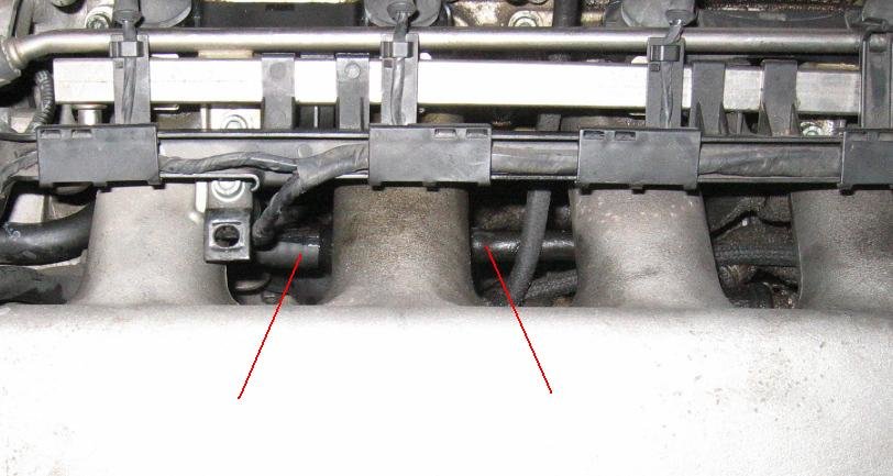 Merci pour le conseil ;) Voici donc une photo avec les 2 emplacements des durites fendues, d'ailleurs il y a comme un capteur entre. Merci de m'aider dans l'identification des références des pièces afin de les changer au plus vite. -