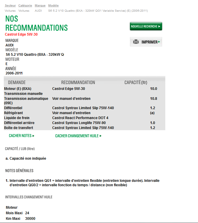oui je les et lus met j'ai peur de me perdre dans les info . je recapitule et on me confirmera ? huile castrol 5w40 vw505.01 ou vw505.07 pour la longlife filtre de grande marque compter 10/12l et le filtre ce trouve sous la baie de parbrise pour la castrol la quel prendre edge magnatec gtx castrol et audi recomande de la edge en 5w30 celle la ferait lafaire ? http://www.oil-car.com/huile-castrol-edge-5w40-5-litres,fr,4,EDGE1L5W40-5.cfm celle la serait peut étre meme mieux http://www.oil-car.com/huile-castrol-edge-5w30-5-litres,fr,4,EDGE1L5W30-5.cfm http://www.befr.ebay.be/itm/Castrol-SLX-Edge-Longlife-3-5W-30-12x1-Liter-Motorenol-VW-50400-50700-7-49-L-/270900896623?pt=Autopflege_Wartung&hash=item3f12f3a36f et derniére question ou trouver les filtre a air a bon prix merci -