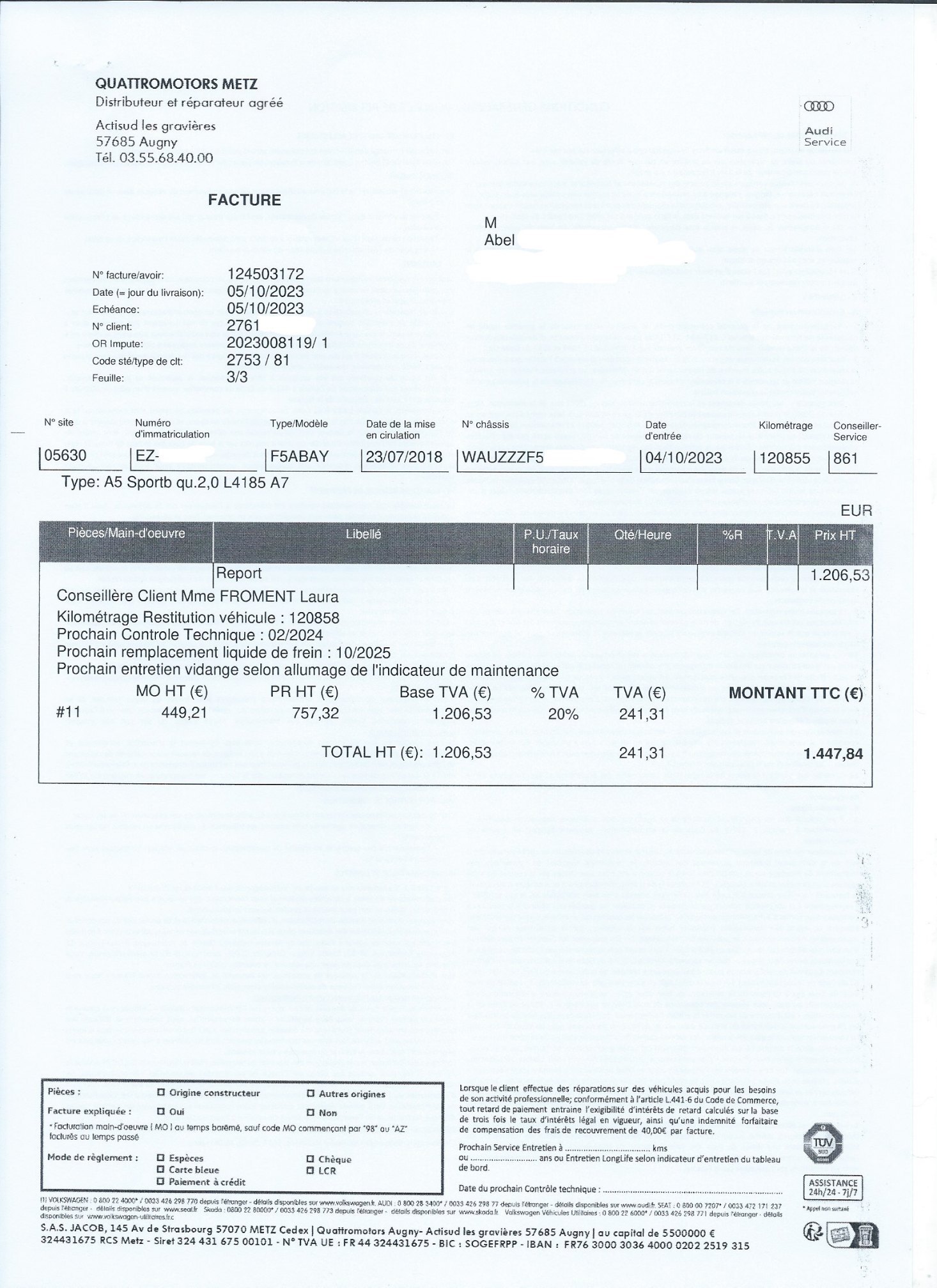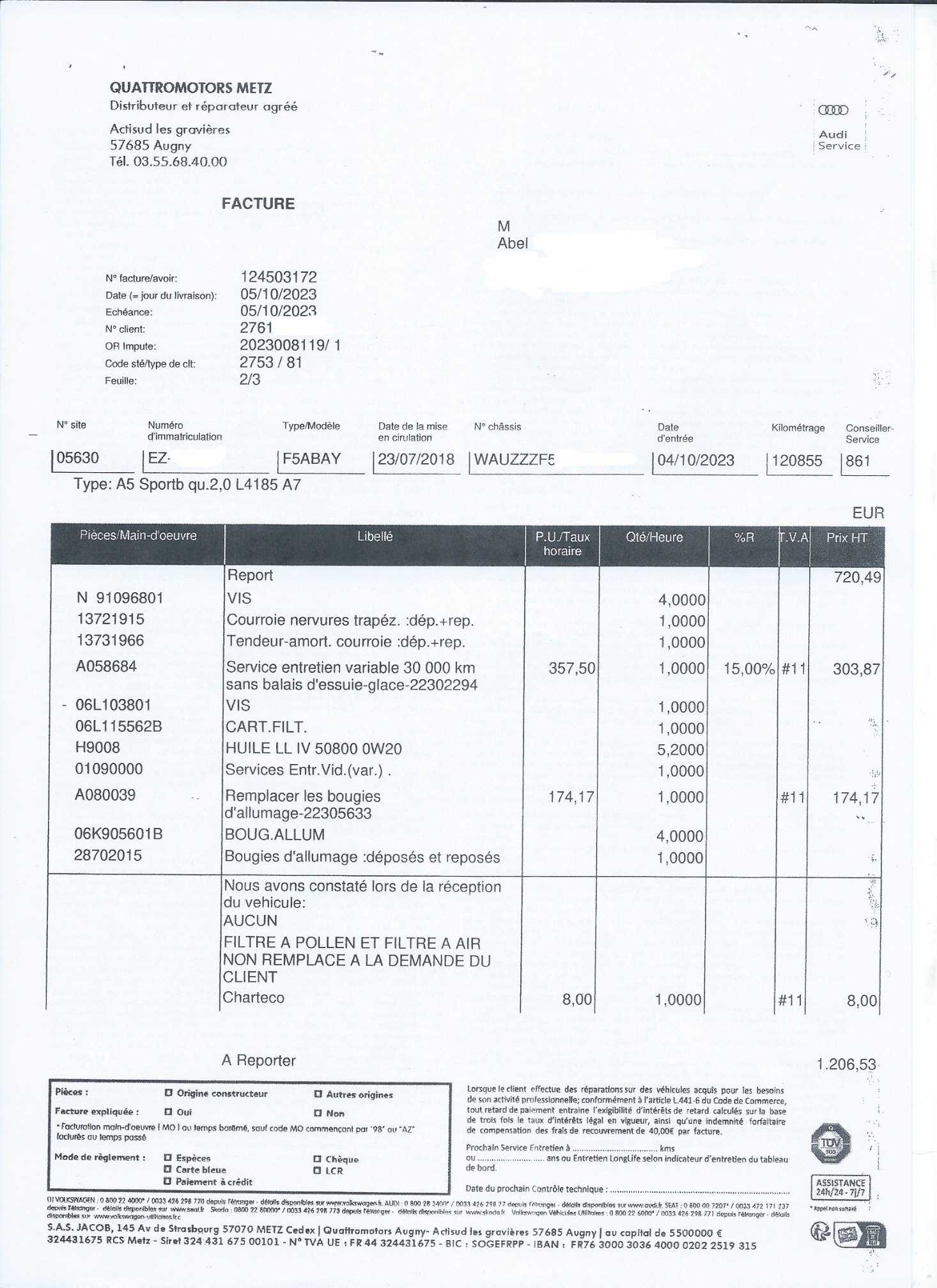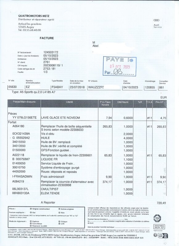 Bonjour tout le monde, J'ai toujours pensé que le gap entretien/vidange était réinitialisé à chaque révision et repartait à 30000. En fait, il évolue depuis la naissance du véhicule. On en apprend tous les jours. Ma voiture est donc sortie de l'atelier ce 05 octobre et que c'est toujours agréable de retrouver un moteur et boîte avec du sang neuf. Mais comme à chaque fois, il y a toujours une petite déception. Pas de petit profit chez Audi : ils m'ont facturé du lave-glace alors que je venais de faire le plein une semaine auparavant. Mais comme je ne l'avais pas signalé ils ont profité de l'aubaine. J'ai aussi dû repasser sur des traces d'huile mal essuyées par-ci par-là. Mon problème d'évaporation de LDR recommence. Après 10000 km, j'ai dû refaire l'appoint. L'atelier a vérifié tout le circuit et n'a pas décelé de fuite. Bien sûr, j'ai demandé si c'était normal et la réponse est « tant que le voyant rouge ne s'allume pas, ce n'est grave ». Prends-moi pour un lapin de trois semaines en moi-même. Une grande première pour ma belle, elle est passée au rouleau après 5 ans d’existence et apparemment le traitement céramique n'a pas souffert. Le rouleau est de « nouvelle génération installé il y a pas longtemps » m'a t-on dit (quand pas longtemps ???). Evidemment, la peinture ne claque pas autant qu'avec un lavage à l'huile de coude, et au niveau des jantes le nettoyage était vraiment perfectible. A remarquer qu'à l'avant de l'alterno, la lamelle de protection en demi cercle a été remplacée par deux demis cerceaux. Pour terminer, voici la note dans les « règles de l'art Audi » mais on finit par s'y habituer. Au moins je suis sûr que les mises à jour cachées sont effectuées. Il serait plus judicieux de faire remplacer la courroie accessoires et éléments tendeurs à 90000. J'ai fait faire un devis à mon garagiste, tout en sachant que je ne lui confierais pas la voiture cette fois-ci. Son offre pour les mêmes travaux est de 1014,00 € !!! Dans son élan de « générosité », la conseillère Audi m'a tout de même offert 15 % de réduction, sur le forfait entretien des 30000 seulement , sans que je lui demande quoique ce soit. -