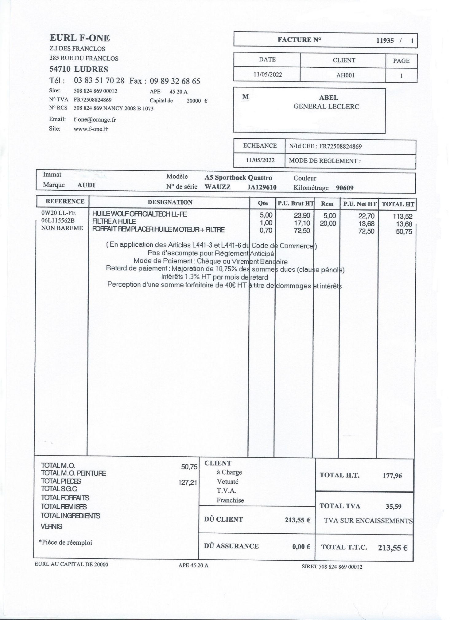Bonjour à tous, Comme j'avais dit dans un de mes précédents posts, j'ai finalement confié ma trottinette chez un indépendant ancien mécano de chez Audi. Et vraiment, je n'ai rien à redire. En plus, le patron autorise les gens à s'approcher de leur véhicule pendant les travaux et ça c'est un vrai plus. Bien sûr le prix de l'huile n'est pas du tout ce qu'on trouve sur internet, mais il faut bien qu'il fasse son beurre aussi le gars. D'ailleurs, il m'a mis une meilleure huile que celle facturée sans en augmenter le prix car il s'en est tout simplement tenu au devis sans avoir pris la peine de le modifier. J'ai remplacé moi-même le filtre d'habitacle (Mann Filter FP 31 003). Au final, si je lui avais demandé de faire le boulot, je suis sûr qu'on est encore très loin des tarifs Audi. L'huile qui a été utilisée : A part ça, voici deux photos de mes roues hiver en vente via le lien ci-dessous : https://forums.audipassion.com/topic/241102-roues-complètes-hiver-a5-sb-b9-sline/ -