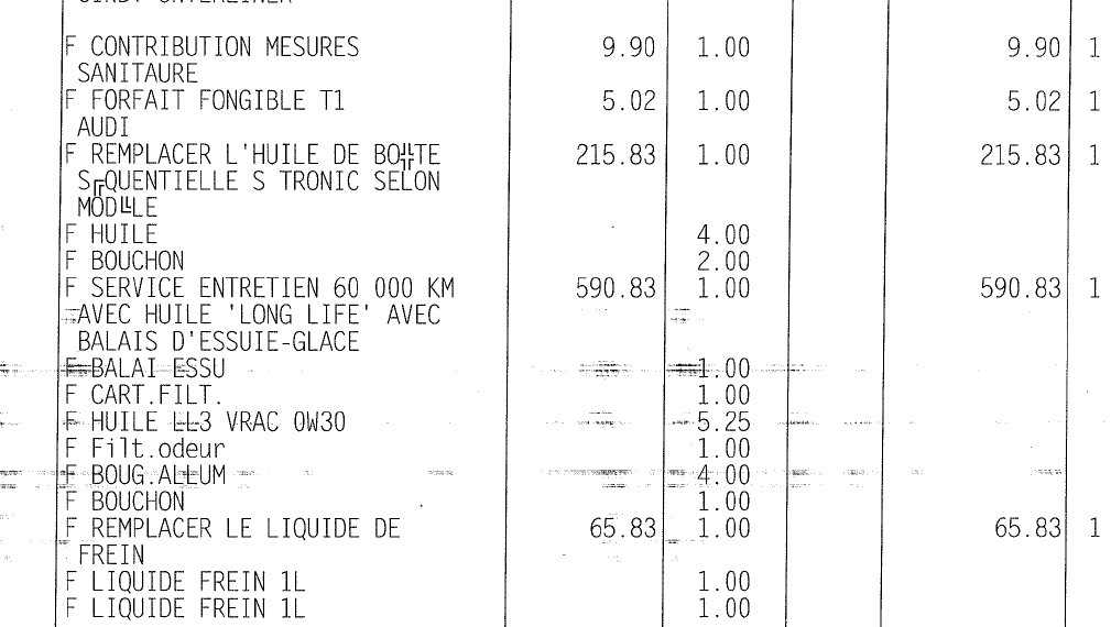 Bonjour à tous, Eh bien voilà ! Service Audi plus au top comme lors du temps ancien où la marque n'était pas encore en concurrence avec Bm ou Merco. En effet, reprise de la voiture à l'issu de l'entretien des 60000 et là surprise(s) : je ne sais pas quelle huile a été mise dans le moteur car à deux endroits de la facture il est mentionné 0W30 et 0W20 au lieu de 5W30 comme lors de la révision des 30000. La voiture devait être mise à jour pour avoir la carte satellite : pas fait alors que j'en avais parlé au téléphone et envoyé un courriel 2 jours auparavant au chef d'atelier. Pas de changement de filtre à air alors qu'il a été remplacé au 30000 ?! De toute façon je remets le BMC aujourd'hui. 887 euros TTC c'est ce que j'ai payé sans remplacement des balais d'essuie-glace (ligne supprimée sur une autre page) avec 15 % de réduction. J'y retourne demain exclusivement pour la MAJ du MMI et leur exactement l'huile utilisée. A part ça la voiture est toujours aussi agréable à mener mais le service ternit le tableau. -