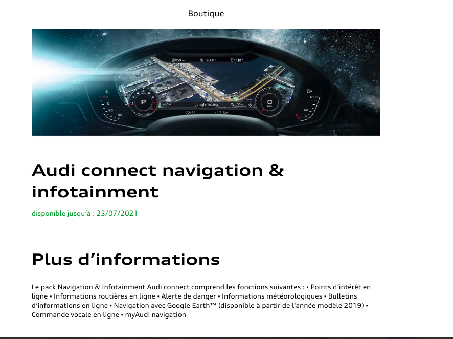 Désolé les gars si je n'ai pas bien suivi depuis le début mais en allant sur la boutique j'ai trouvé ceci : Cela voudrait-il dire que nos "vieux" modèles antérieurs à 2019 ne pourront plus bénéficier de la carte satellite ? Dans ce cas, à 220 € c'est une Audi arnaque de plus ! Y a-t-il un moyen de contourner leur système ? -