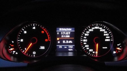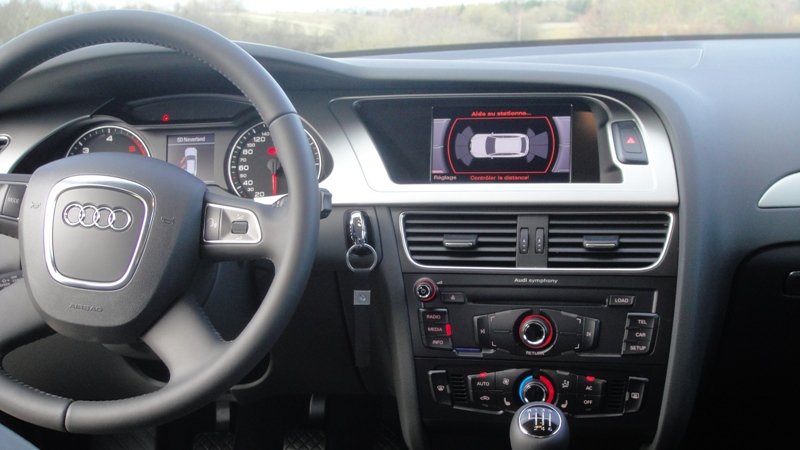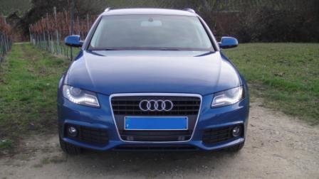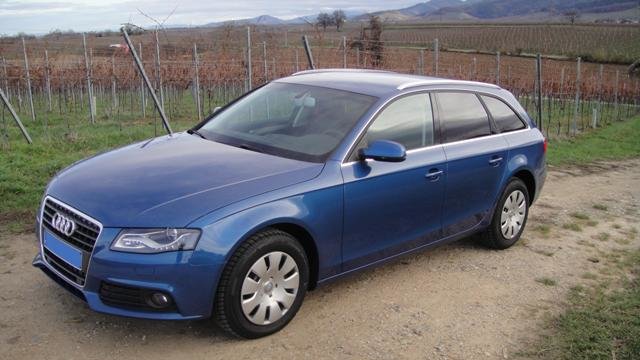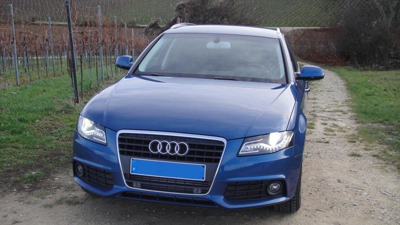 Eh bien voilà, je reviens à l'instant de chez le concessionnaire où j'ai pris pris possession de ma nouvelle voiture. J'ai pris une base Ambiente en Allemagne et je l'ai alignée sur une Ambiente française pour une éventuelle revente ultérieure. En voilà donc la description : - A4 Avant Bleu Aruba 2.0 TDI 143 Cv finition Ambiente "Allemagne" - Boite manuelle 6 rapports - Servotronic (en option sur la finition Ambiente en Allemagne) - Désiglage de la malle arrière - Rétro chauffants et rabattables électriquement - Système d'alarme (on est jamais trop prudent) - Aide au stationnement avant-arrière avec pictogrammes - Autoradio Symphonie - Audi Sound System - Sièges cuir Milano noir - ODB couleur avec programme Efficience - JA 18" 5 branches - Surteintage des vitres arrières - Xenon Plus - Sièges chauffants (de série sur Ambiente Allemagne) - Accoudoir - Pack éclairage - ... Au risque de voir débarquer les pandas, je n'ai pas fait de photos de l'extérieur de la voiture aujourd'hui car il faisait un temps horrible et de plus elle est chaussée en roues hiver (jantes en tôle avec enjoliveurs de 16 "). Je n'ai que 2 "malheureuses" photos du tableau de bord ce matin à la réception avec à peine 15 kilomètres et l'autre après être arrivé à la maison. J'en mets une 3° d'une rencontre en chemin. Premières sensations super agréables : c'est silencieux, le système Start And Stop m'a surpris la première fois, le son de l'autoradio est génial, en 2 mots que du bonheur. Et le comble, c'est une voiture allemande mais le vendeur m'a dégoté un mode d'emploi en français (en plus de celui en allemand).