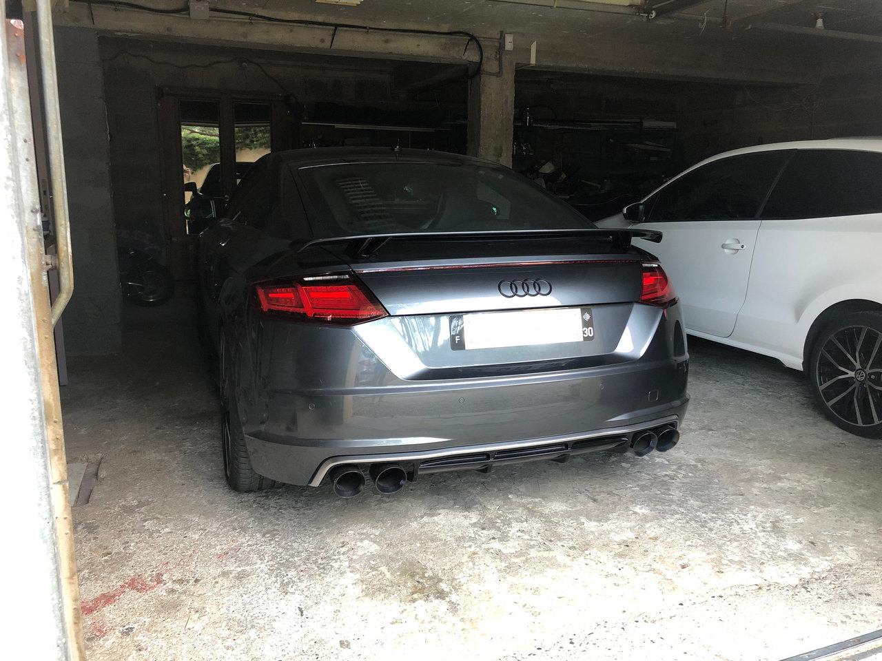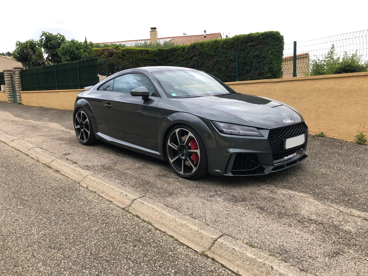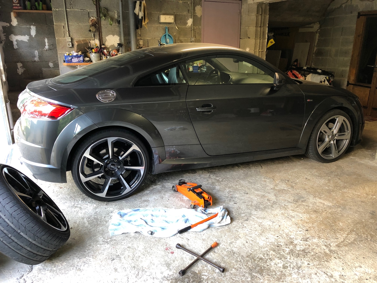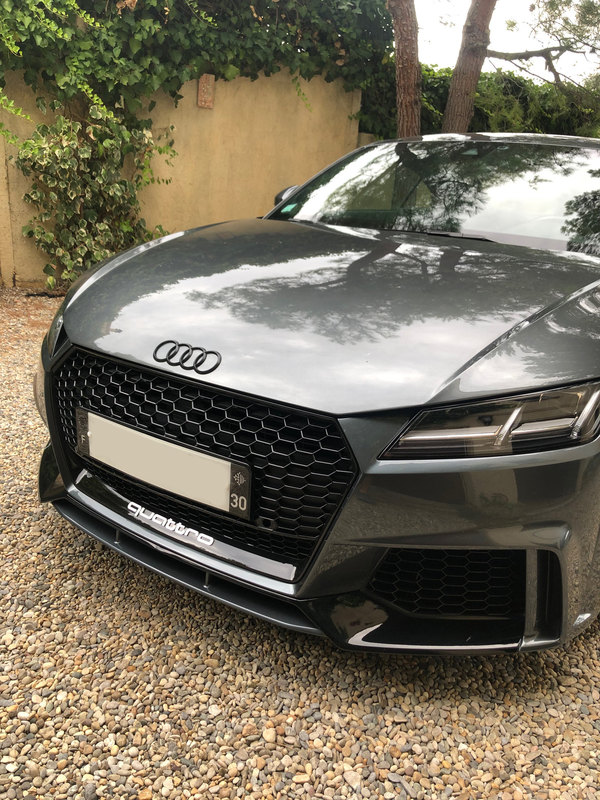 Salut tout le monde, Voici une présentation de ma nouvelle voiture : Une audi TT mk3 S-line Quattro d'octobre 2014 avec 50100km au compteur lors de l'achat (08-04-2019) Quelques options : Son Bang et Olufsen Active lane assist Phares full LED Sièges sport cuir alcantara noir avec coque nacré ... Les modifs : Compteur TTS (obd eleven) Dé-siglage complet Plaques noires Jantes TTRS 20" (leboncoin) Etriers TTRS 8 pistons avec disques audi wave 370x34 (acheté sur killerbrakes, site que je recommande) Par choc avant TTRS (Ebay.de) /!\ quand vous achetez ce pare choc même esthétiquement complet il y a énormément d'éléments qui se trouve derrière à rajouter j'en ai eu pour 400e de pièces en plastique, mousse et visserie... Calandre style TTRS (ebay.co.uk en provenance de chine) Pièces à monter : Diffuseur de TTS noir laqué (j'attends mon catback) Becquet de TTRS (je le poserai à la fin) Les futures modifs : Le catback 4 sorties noires en 100 avec bypass Suppression des badges "s-line" sur les cotés Liseret rouge dans les aérateurs Ressorts courts h&r Reprog flexfuel (ou simple) Peinture étriers arrière (peut-être) Je vous passe le détail des petites modifs "classiques" sur VCDS Une photo d'origine à l'achat : Puis on a commencé les modifs : Le changement du compteur pour avoir la zone rouge en rouge pleine avec les chiffres en italiques (fait avec obd eleven) Suppression des badges à l'arrière : S'ensuit alors une tentative de montage des étriers de la TTRS avec disques wave en 370x34 Pour info, ces jantes ne passent pas avec ces étriers. Donc changement des jantes : Re-remontage des disques et étriers : Modif des aérateurs, modif qui n'a pas tenu ;( (j'ai commandé autre chose qui devrait aller cette fois) Changement du pare choc avant pour celui de la TTRS avec calandre nid d'abeille Une petite photo du tout : RDV fin Mai pour le catback avec diffuseur tts en noir laqué.