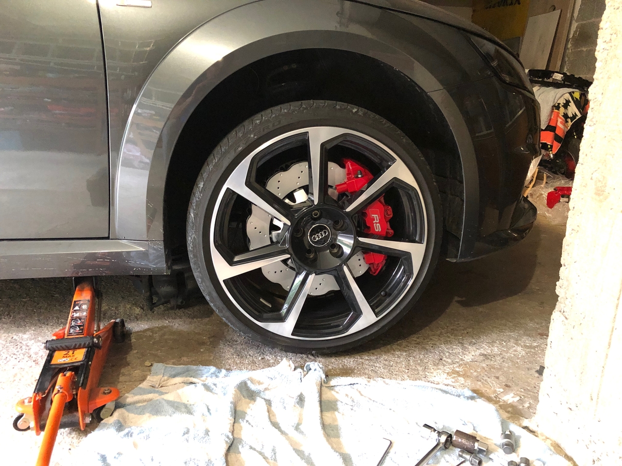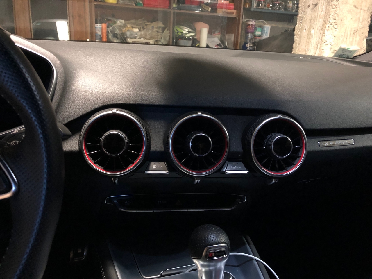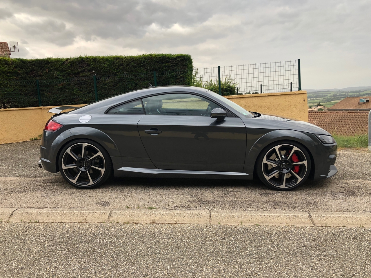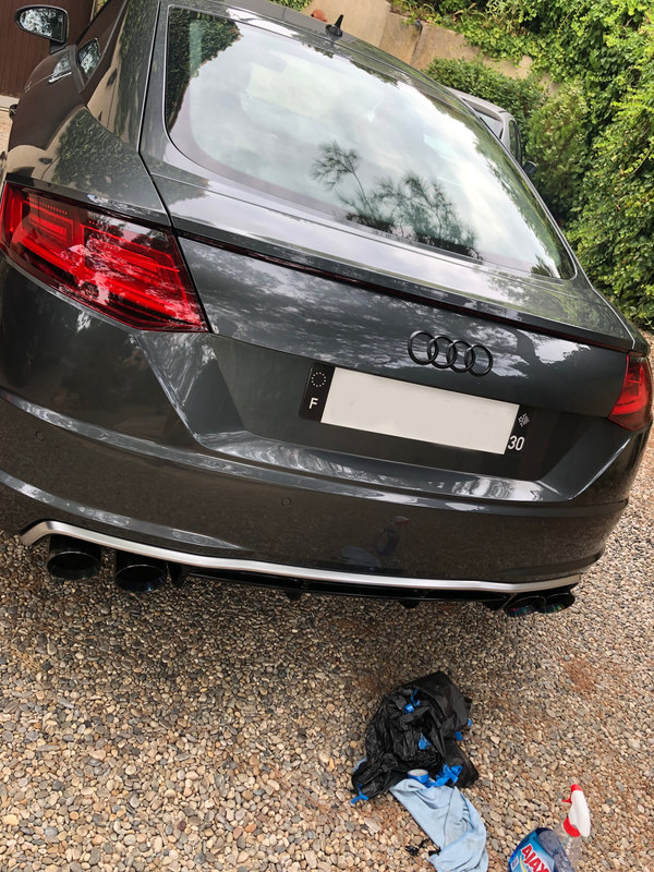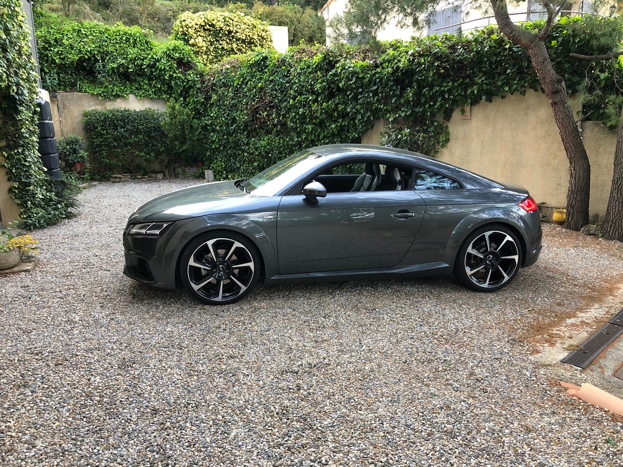 Salut tout le monde, Voici une présentation de ma nouvelle voiture : Une audi TT mk3 S-line Quattro d'octobre 2014 avec 50100km au compteur lors de l'achat (08-04-2019) Quelques options : Son Bang et Olufsen Active lane assist Phares full LED Sièges sport cuir alcantara noir avec coque nacré ... Les modifs : Compteur TTS (obd eleven) Dé-siglage complet Plaques noires Jantes TTRS 20" (leboncoin) Etriers TTRS 8 pistons avec disques audi wave 370x34 (acheté sur killerbrakes, site que je recommande) Par choc avant TTRS (Ebay.de) /!\ quand vous achetez ce pare choc même esthétiquement complet il y a énormément d'éléments qui se trouve derrière à rajouter j'en ai eu pour 400e de pièces en plastique, mousse et visserie... Calandre style TTRS (ebay.co.uk en provenance de chine) Pièces à monter : Diffuseur de TTS noir laqué (j'attends mon catback) Becquet de TTRS (je le poserai à la fin) Les futures modifs : Le catback 4 sorties noires en 100 avec bypass Suppression des badges "s-line" sur les cotés Liseret rouge dans les aérateurs Ressorts courts h&r Reprog flexfuel (ou simple) Peinture étriers arrière (peut-être) Je vous passe le détail des petites modifs "classiques" sur VCDS Une photo d'origine à l'achat : Puis on a commencé les modifs : Le changement du compteur pour avoir la zone rouge en rouge pleine avec les chiffres en italiques (fait avec obd eleven) Suppression des badges à l'arrière : S'ensuit alors une tentative de montage des étriers de la TTRS avec disques wave en 370x34 Pour info, ces jantes ne passent pas avec ces étriers. Donc changement des jantes : Re-remontage des disques et étriers : Modif des aérateurs, modif qui n'a pas tenu ;( (j'ai commandé autre chose qui devrait aller cette fois) Changement du pare choc avant pour celui de la TTRS avec calandre nid d'abeille Une petite photo du tout : RDV fin Mai pour le catback avec diffuseur tts en noir laqué.