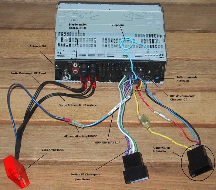 Salut Manuel.P, Tu m'inquiètes Ci-joins la photo du branchement avec le fameux cable bleu comportant l'inscription AMP REM MAX 0,3A dont je me sers pour alimenter l'ampli Bose. Sur le manuel d'installation de l'autoradio, ils ne parlent pourtant que de ce cable pour alimentation. A quoi sert le cable de commande ampli ?