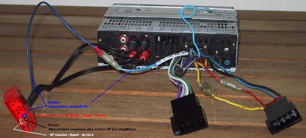 Salut RaMbLe, Excellent tutorial ! Je cherche moi aussi a remplacer mon Concert I + Bose par mon ancien autoradio SONY. Comme le tient, mon autoradio étant aussi doté de 4 fiches RCA (pour le connecter directement à un ampli). J'ai donc recherché et trouvé l'interface la mieux adaptée à mes besoins : Aktivsystem Adapter BOSE AUDI SEAT VW Lautsprecher. Je n'ai eu aucun problème d'installation, donc hyper content le zouze Je m'attendais ensuite à n'effectuer que quelques réglages de balance... Je n'ai eu aucun son sur les HP arrières et un gros claquement dans l'HP avant gauche, à chaque fois que je change de station sur mon autoradio J'ai pu lire dans ton post que les claquements provenaient d'un problème de masse. Je vais donc pouvoir résoudre ce problème facilement, je te remercie. Par contre, j'ai pu aussi constaté qu'aucun son ne sortait sur les HPs arrière. Donc je pense que le petit boitier noir de l'interface que tu as installé Aktivsystem Audi Radioadapter A2 A3 A4 A6 TT auch Bose sert entre autre à activer l'ampli BOSE. Est-ce que tu pourrais me confirmer la chose stp ? encore merci et a+, Zouze.