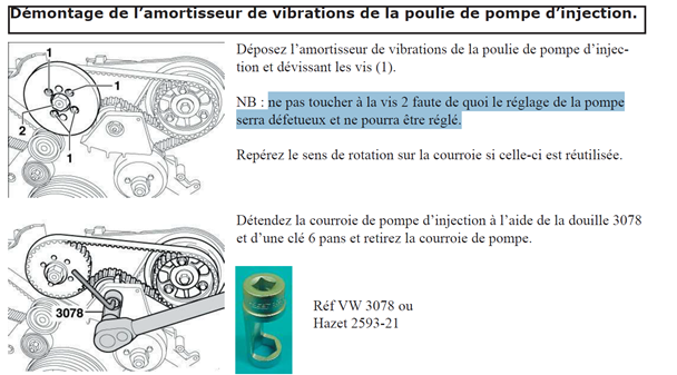 Merci phil en fait j'ai desserré 2 raccords, cela a permis de purger au démarreur et j'ai resserré= la bagnole a démarré correctement (sans erreurs pendant 1' env). Je suis d'accord avec toi, le changement de filtre GO, je fais gaffe à remplir le reservoir et injecter avec une seringue du gasoil dans les durites, de partout Il est peut etre possible que le driver ait dégusté (les fils étaient dénudés, c'est un fait) ou autre chose L'erreur s'aquitte à chaque fois, et pas d'autres erreurs (type "injection" vue par ailleurs) que celle-ci. J'aimerai en avoir le coeur net, il ne s'agit pas de me lancer sur un echange standard et que cette erreur revienne Je vois 2 pistes/tests: une problèmatique d'alimentation GO/ Je ne sais comment l'alimentation du réservoir vers le filtre est fait: présence possible de substance qui obstrurerai partiellement? la pompe de transfert qui fait le bazar? l'audi a 345mkm, jamais fait de ce coté là (ni PI d'ailleurs) Pour le test 1 , je pensais remplir le réservoir au moins au 3/4? (actuellement un peu + du 1/4 du réservoir) et ainsi m'affranchir du test2 ci -après ou test 2 bidon en l'air? (c'est bien sur l'embout "a"? ) une problèmatique callage/décallage, VCDS, dégrés retard/avance (ces termes me font fllipper) La courroie qui ne semble pas la principale ce serait détendu? C'est possible? Iici un lien d'un gars qui explique comment il change une vp44 test 1 Des valeurs à vérifier via vcds? Voire corriger? test 2 vérifier si la pompe est bien callée? "Piger" et remettre une courroie? peut-etre Si vous avez des idées de tests et procédures, welcome!