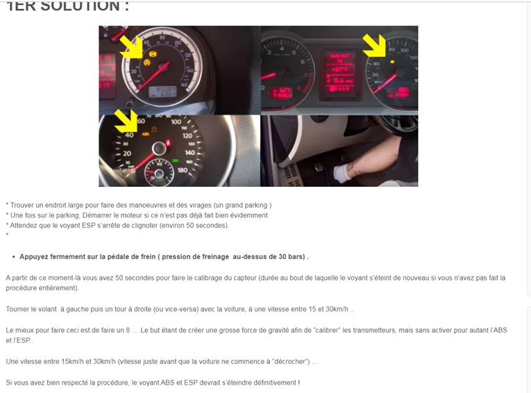 Bonjour, merci je me disais aussi, je pensais avoir un "vag com" hs Oui ça c'est fait; Merci pour la traduction de la vrai valise ==> nos vag com Dans la procédure, j'ai cliqué un moment sur "mettre le détecteur d'angle à 0°" Je vais faire un tour voir ce que cela donne. Donc à moins de 20 km/h, droite-gauche + une ligne droite et j'attend que les voyants disparaisse puis validation au vag com sans couper le contact? a+ -