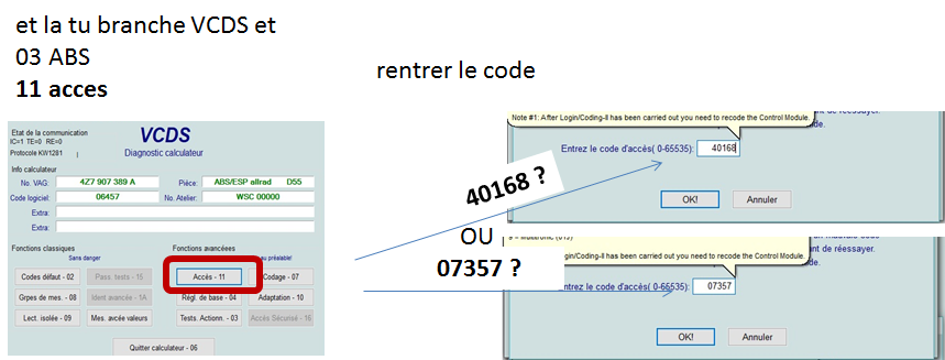 coté calculateur: je pense avoir réussi à le coder Les voyant ESP et ABS restent allumés au tableau de bord je galère avec la config G-85 ou plutôt, comment "rentrer dans en mode conf J'ai trouvé ceci: Procédure de calibration sur Passat et Audi A4/S4/A6/S6 et A8/S8: <Sélectionner> <03 - Freins ABS> <Accès - 11> Entrez le code 40168 <OK!> <Réglages de base - 04> Choisissez le groupe 001 <Go!> Ceci mettra en mémoire la position actuelle du volant comme étant le zéro. Vous devriez recevoir un message vous informant du succès de la procédure; si une erreur est affichée, cela signifie qu'elle a été mal éxécutée Autre procédure utlisé par Pascal: j'ai un peu de mal là à comprendre.... . -