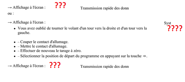 ok, j'imprime ça et go! thanks alors mes tests pas encore concluants toujours le message: voici comment j'ai fait: *********************************************** tu démarres le véhicule. ‒ Tourner le volant d'un tour vers la droite et d'un tour vers la gauche. sans rouler ‒ Faire un bref parcours d'essai (50 m) sur une surface plane. Conduire en ligne droite et à une vitesse inférieure à 20 km/h. ‒ Si le volant est droit lors du parcours d'essai, arrêter le véhicule en trajectoire de ligne droite. sans arreter le moteur ‒ Effectuer alors le tarage à zéro Veiller à ce que le volant ne soit plus déréglé. Ne pas couper l'allumage ! ensuite; mais toujours le msg (et que Pascal suite au recodage du calculateur sur sa vidéo) 01486 Test de fonctionnement du système activé 35-00-- J'ai foiré quelques part, mais où? -