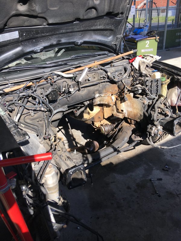 salut les car-marades bon ! team titan du lundi inefficace ! ....rien na bouger ! aller aujourd’hui (après le taf forcement) début du bazar ! dépose façade , compresseur de clim et son condenseur mis de coté , dépose d un bout de l’échappement ( peu etre du 17 ou du 16.5 enfin rouillé mais ca na pas casser) , un bout du reste des connexion électrique ( une galère sans noms ... ) , les protections thermique de l'arbre de transmission arrière et le défaire , les arbres avant .... merci a la roue et au bras inférieur pour aider la clé a forcer (embout nortoto, rallonge plus cliquet 1/2) ca passe . voila en plus recherche le moyen de levage , élingue, sangle, chaîne, manille , impression de quelque doc du mécano, commande des bières et des casses dalle pour demain soir ou (A)normalement le groupe motopropulseur devrait etre déposer . si ! en vue! recherche : joint spi sorti BVA ou torsan (je ne sais plus comment ça se nome) ,crépine BVA , full filtre moteur , kit distri+pompe a eau ,calorstat, courroie accessoire ,la sonde T° casser, les vis de plateau d'entraînement ( a voir! on ma dit que ca casser), et un vag.com pas cher et officiel jais vue sur le poste récent sur le désamorçage pompe ou pas pompe de gavage ,relevage, aspiration, soufflage, enfin le truc dans le réservoir !!!... je partirai aussi sur tout les silant bloc des bras avant ou un kit bras de suspat a voir si les rotules et leurs soufflets sont naz , et les soufflet de cardan avant qui eux sont naz , une galere ............................................. sans.................................................................. NOM.............. punais il est gras ce vieux moteur plus encore plus ...... -