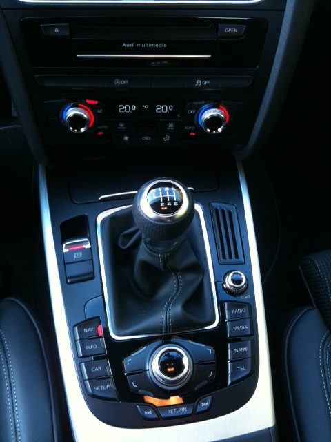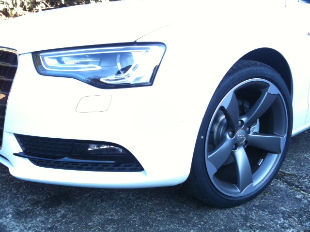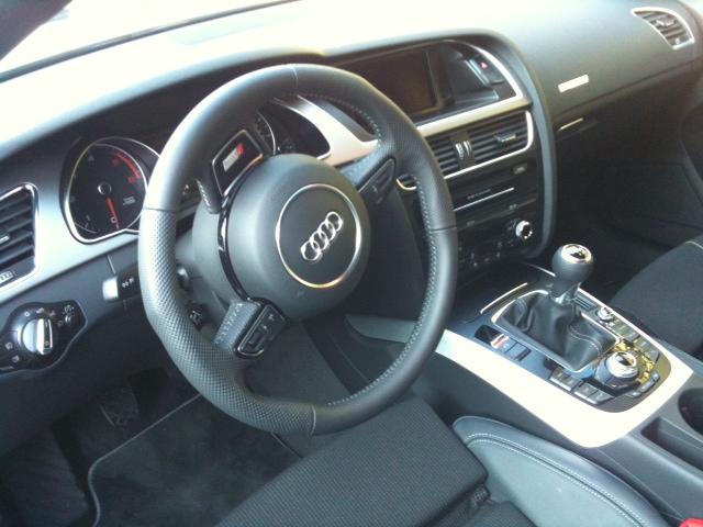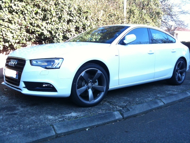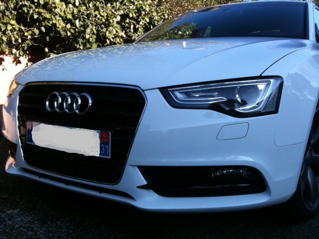 7. Bonjour, Pour vous faire saliver, voici une première photo prise rapidement sur le parking de LeRoy Merlin. Comme vous pouvez le voir, je ne pouvais pas me garer plus loin... J'ai fait 200 kms hier et c'est un régal. Avec pour seule référence mon ex Citroën C5 (qui était confortable), je trouve en effet que l'A5 ne joue pas dans la même catégorie... Elle est collée à la route, vire à plat, est extrêmement confortable et silenciese et le moteur 2.0 177 est souple et très puissant (comparé à mon ex 1.6 HDI 110). J'ai croisé quelques A5 (avant facelift) et j'ai l'impression de faire partie d'un club. L'un d'entre eux sur l'autoroute m'a même fais un signe (pouce vers le haut). J'ai encore un peu de mal avec les commandes du MMI mais ça commence à venir. L'éclairage intérieur (plafonnier) est particulièrement moche, il faut vraiment que je remplace les lampes classiques par des LED. Idem pour les anti-brouillards avants, il paraissent jaunes sous les LED des phares. Par contre, je n'ai aucun éclairage intérieur au niveau des jambes ainsi que dans la boîte à gants. Ca doit certainement faire partie du pack éclairage... Je vais regarder s'il manque seulement les ampoules ou s'il n'y a rien... Si certains ont des s-line, merci de me dire si c'est identique sur les votres. Le redemarrage en start&stop est suffisament pratique à mon sens. Je vais encore faire quelques essais cet après-midi et je ferai une bonne rafale de photos que vous verrez certainement ce soir. Kach