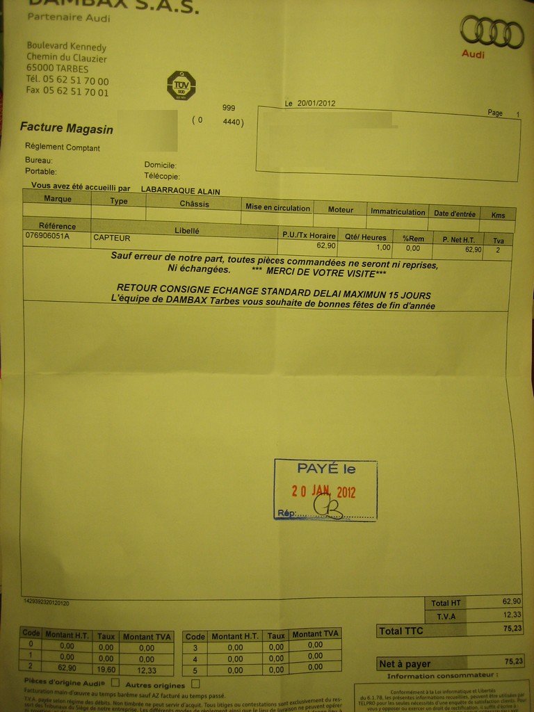 Donc 75.23€ TTC chez AUDI. 0% de remise j'apprecie....La facture en fichier joint en me souhaitant une trés bonne fin d'année! LOL!!! Même prix chez Skoda, VAG ou SEAT... normal quoi! Ces capteurs ils en ont changé 'à la pelle' sur les TDi (toutes marques confondues)...le magasinier connait la reference par coeur... J'ai effacé le défaut avec VAGcom et je suis parti rouler. Au bout de quelques kms le voyant FAP s'est ensuite eteint. Je pense que mon problème est donc réglé. Le capteur est trés facile à changer si on est un tout petit peu bricoleur. Un connecteur electrique à deconnecter, une vis torx et deux durites à débrancher/rebrancher.Ne pas hesiter à le faire soi même donc pour éviter une douloureuse chez votre concessionnaire préféré. -