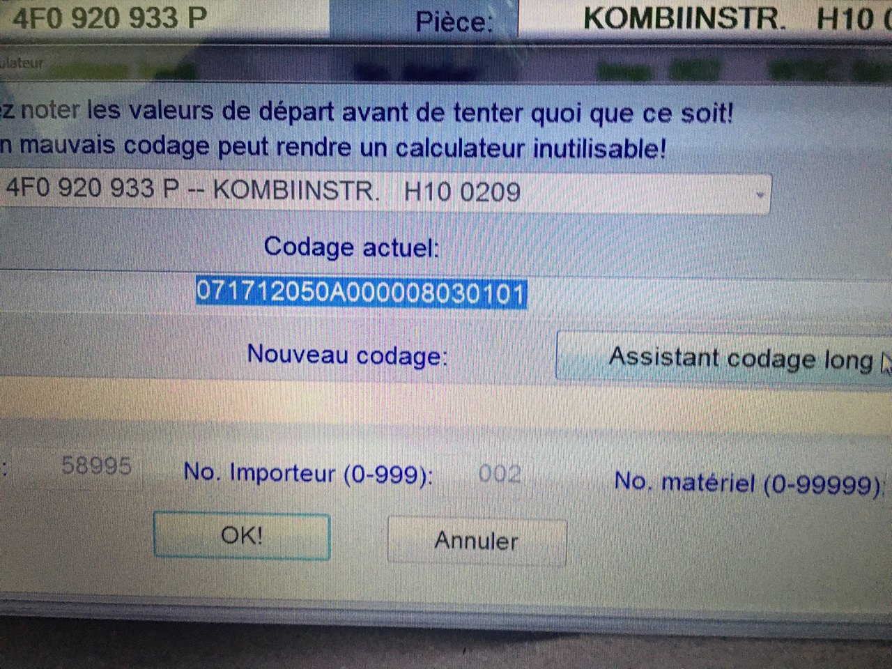 Alors retour de chez audi revérification de toutes les paramètres résultat même topo il ne comprend pas pour lui tout est ok voilà une photo du nouveau codage si des fois Sam pouvait me faire une photo de son codage se serait sympa -