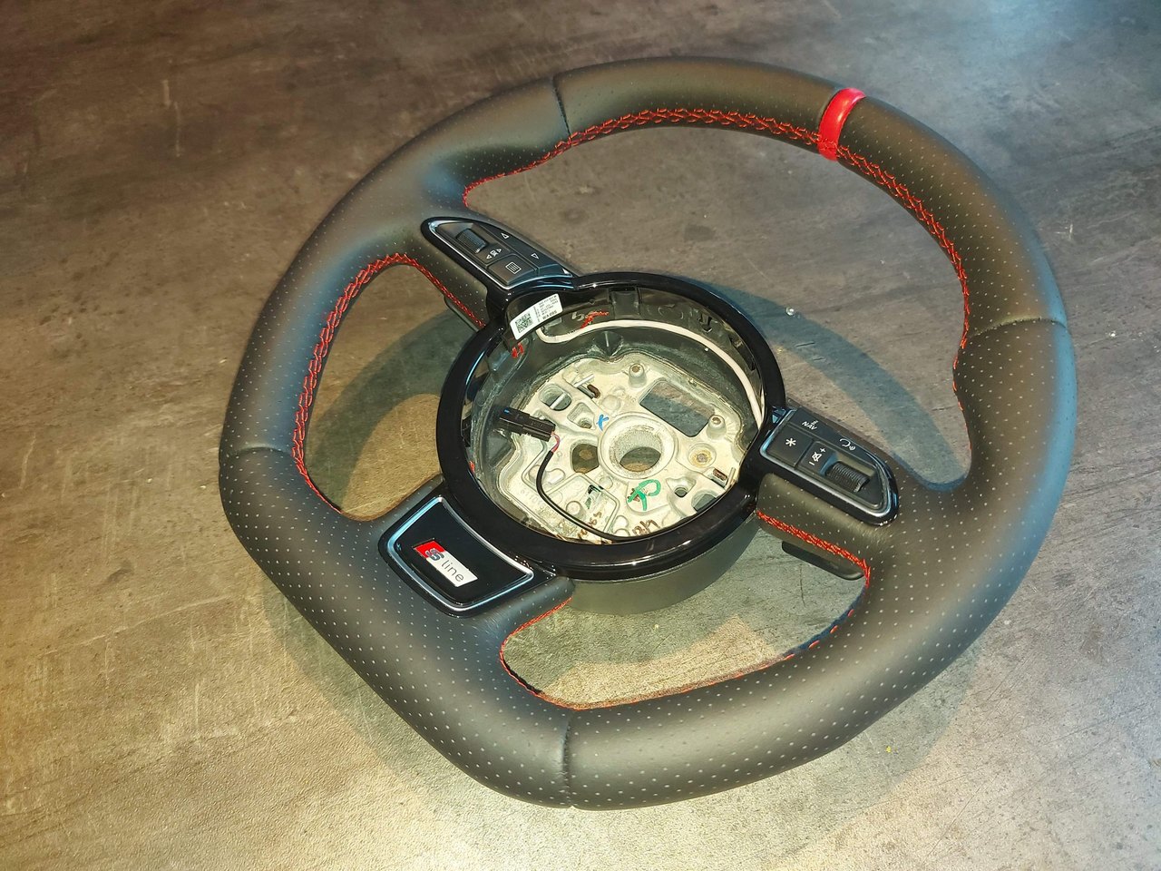 Alors pour la modif du volant, j'en ai eu pour 300 euros tout rond... Création d'un méplat, surpiqûres rouges, cuir perforé, Baquet rouge 12 heures, etc... J'ai choisi cette option pour plusieurs raisons... Pas de soucis de compatibilité avec mon airbag,totalement plug&play, pas de modif via vcds ou autre nécessaire pour les commandes ou palettes par exemple, je n'ai pas à m'ennuyer avec la revente de mon ancien volant, etc... Franchement, la qualité est au rendez-vous, pour le tarif, je suis ravi... 😍😍😍 À noter qu'une fois le volant déposé, j'ai eu peur de casser les commandes, palettes, etc au démontage... 😅😅😅 Du coup j'ai envoyé le volant tel quel, avec tout les éléments en place,et elle me l'as renvoyé tout remonté, comme sur les photos...😊😊😊 Voici le volant qui as servi en partie de modèle :le but était d'avoir un volant sympa, proche de l'origine, et surtout pas trop exubérant comme on peut voir parfois... -