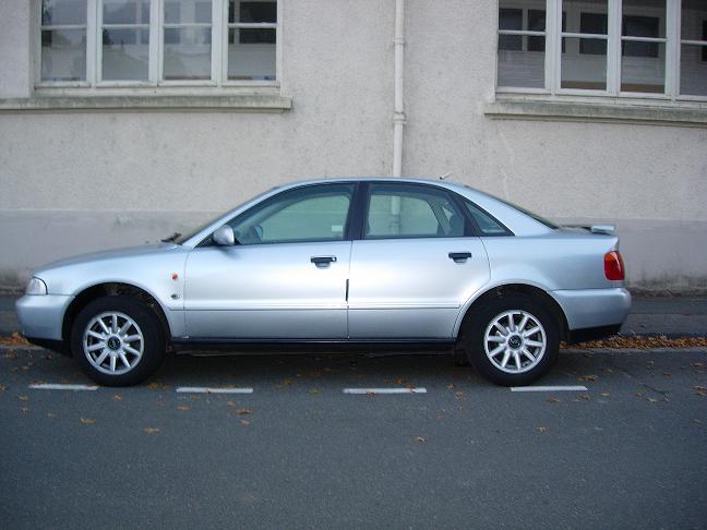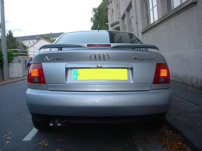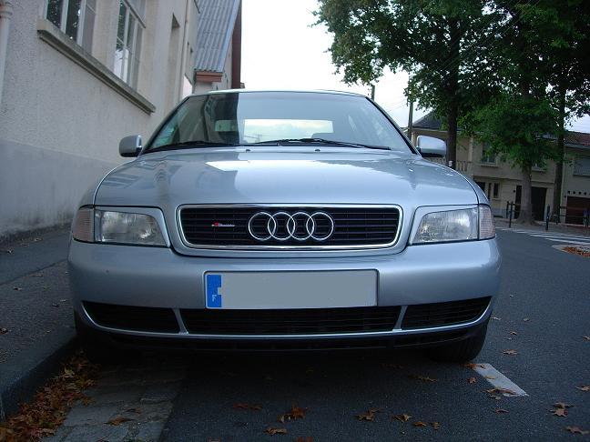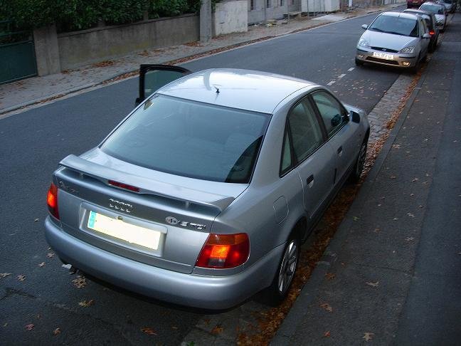 voila à mon tour de vous présenter ma titine Audi A4 1.9 TDI 90Ch de 1998 avec 198000 kms au compteur... j'ai rajouter le spoiler, peints les rétros, ajouté des paupières et j'ai rajouté des monogrammes Sline (je sais vous allez dire que c'est ridicule mais je trouvais que ça rajoutais un petit plus sur la voiture... ) Les jantes sont des jantes d'une audi 100 en 15 " 195-65-R15 sur la photo ou on la voit de côté on a l'impression qu'elle est haute sur pattes mais ce n'est qu'une impression (c'est simplement que la route est inclinée) A propos,j'aimerais enlever le macaron "F" car je trouve ça pas franchement beau...c'est l'ancien proprio qui l'a mit le problème c'est qu'il est collé !! pouvez vous me dire comment faire ? merci