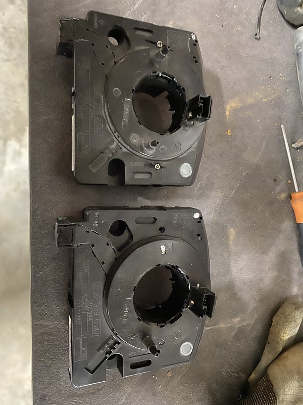 J’ai trouvé le coupable ! c’était le capteur d’angle de braquage (G85) en lui même. Lorsque j’ai débranché la fiche jaune sur la photo ci-dessous, plus de problème. Et par un coucours de circonstance il se trouve que j’en ai un dans mon bazar mais qui est réputé HS. Sauf qu’en regardant bien, il semble que ce G85 soit composé de 2 parties superposées : l’électronique qui calcule l’angle de braquage + le contacteur tournant qui fait office de capot. Il ne m’en fallait pas plus pour tenter d’intervenir les parties OK des 2 pièces. Eurêka ! Tout fonctionne très bien. Le klaxon retenti enfin que lorsqu’on appuie sur le volant et le capteur d’angle donne des valeurs cohérentes sur VCDS [03 - Brake Electronics] [Measuring Blocks - 08] Group 004 -