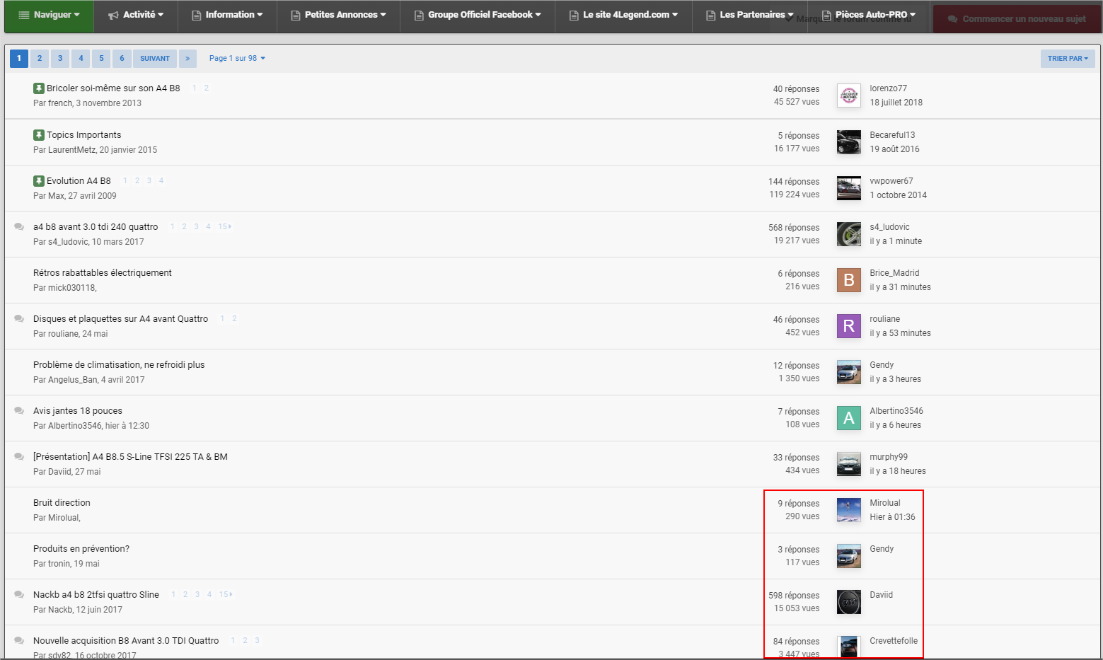 Bonjour, j'ai remarqué sur certaines pages que, sur certains sujets, je n'avais pas de date de dernière intervention en dessous du dernier pseudo à avoir commenter.